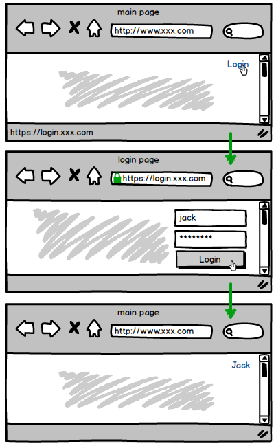 这是最经典的登录模式。尽管主页面并没有开启 HTTPS,但登录时会跳转到一个安全页面来进行,所以整个过程仍是比较安全的 —— 至少在登录页面是安全的。